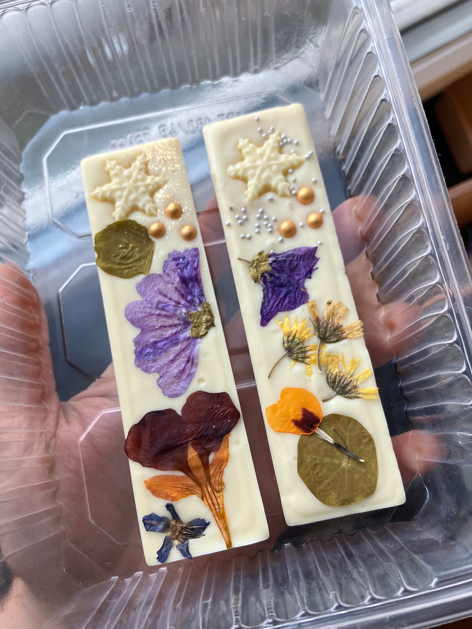 Handbeschilderde bonbons en een klein bloemenreepje.